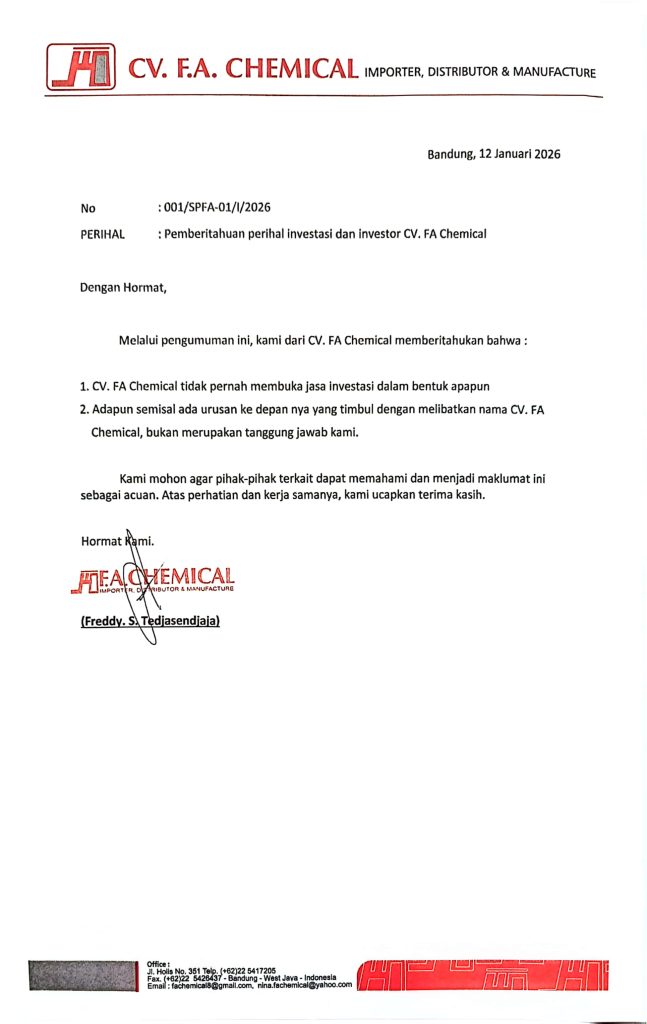 - CV. FA Chemical tidak pernah membuka jasa investasi dalam bentuk apapun